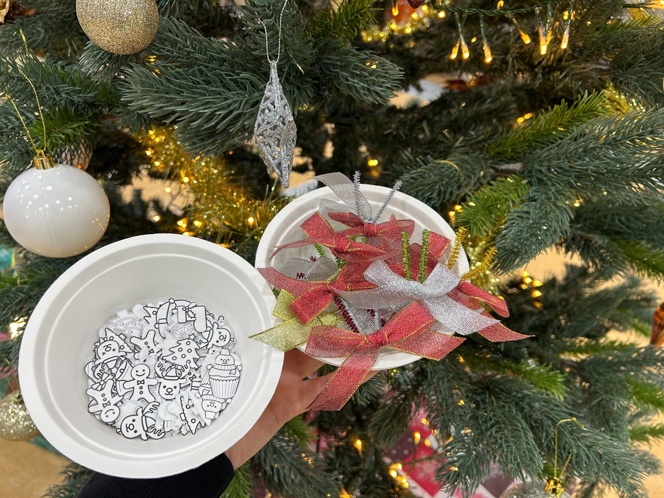 トナカイやサンタクロースの飾りに色を塗って貼ったりリボンをつけたりして